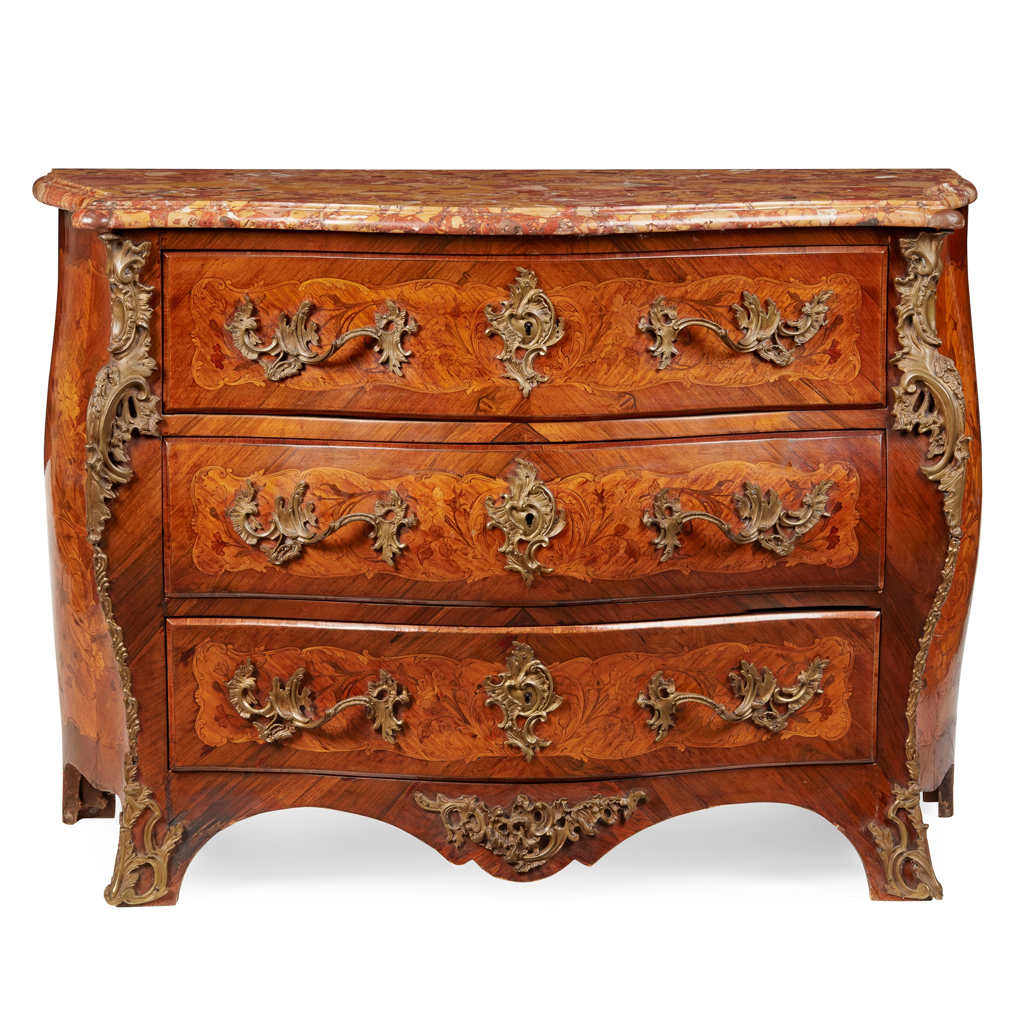the brêche d'Alep marble top with a moulded edge above three long serpentine bombé drawers with foliate marquetry panels, with acanthus and rocaille bronze mounts and handles, raised on short splayed bracket feet