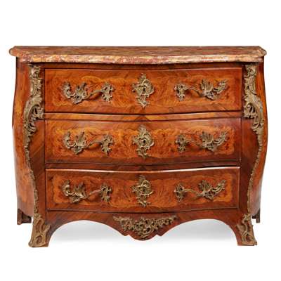 LOUIS XV STYLE PURPLE WOOD AND KINGWOOD MARQUETRY COMMODE