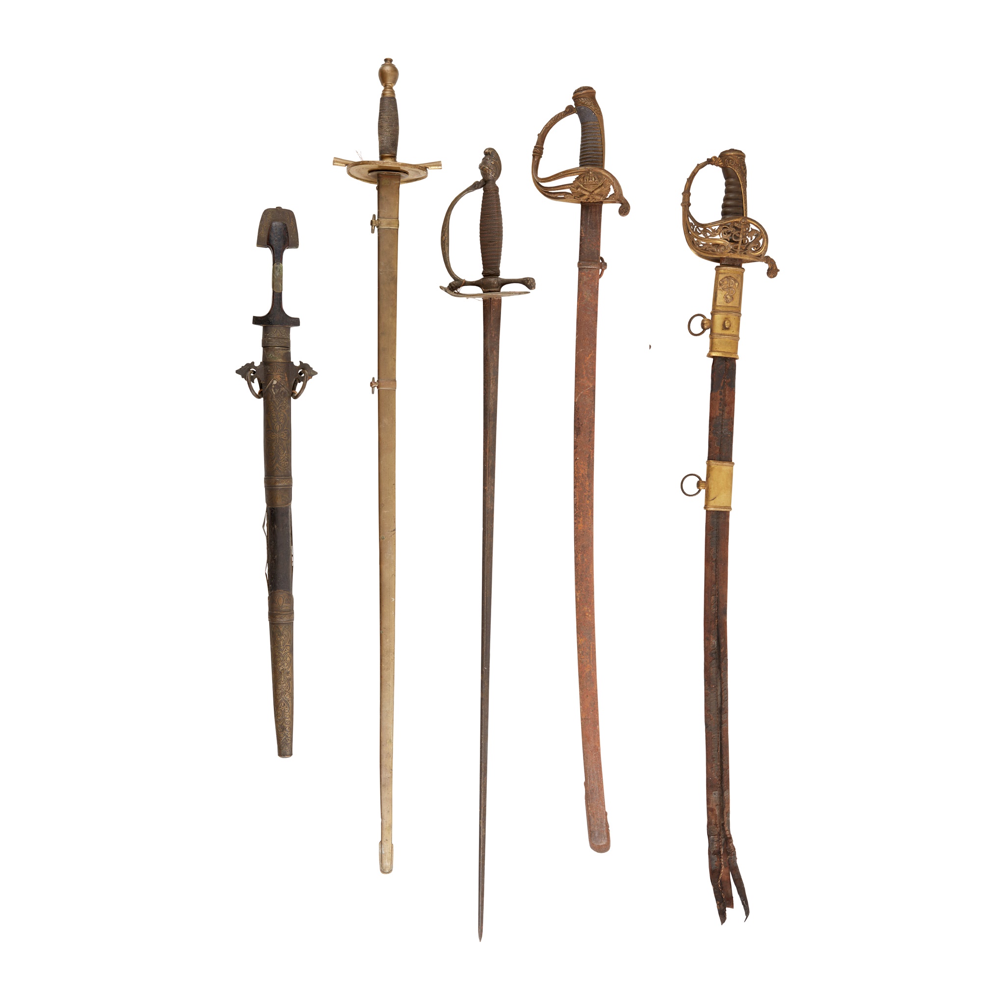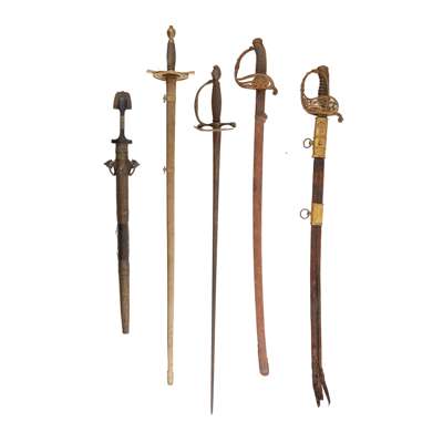 including FRENCH NAVAL OFFICER'S SWORD, the steel flat back blade, ornate pierced brass hilt with fouled anchor and acanthus, ebony grip with cockle shells engraved with initials 'VC', with the remnants of a brass mounted leather scabbard and suspension loops; a SPANISH ARTILLERY OFFICERS SWORD, dated 1880, the blade etched with scrolling foliage and 'Artilleria Fabrica de Tuledo', pierced brass handle and steel scabbard; a CONTINENTAL CROSS HILTED SWORD, with engraved blade with wire wrapped handle and brass scabbard; a CONTINENTAL CROSS HILTED SWORD, with engraved triangular épée blade with wire wrapped handle; and a NORTH AFRICAN BERBER TYPE SWORD, with engraved brass and wooden mounts