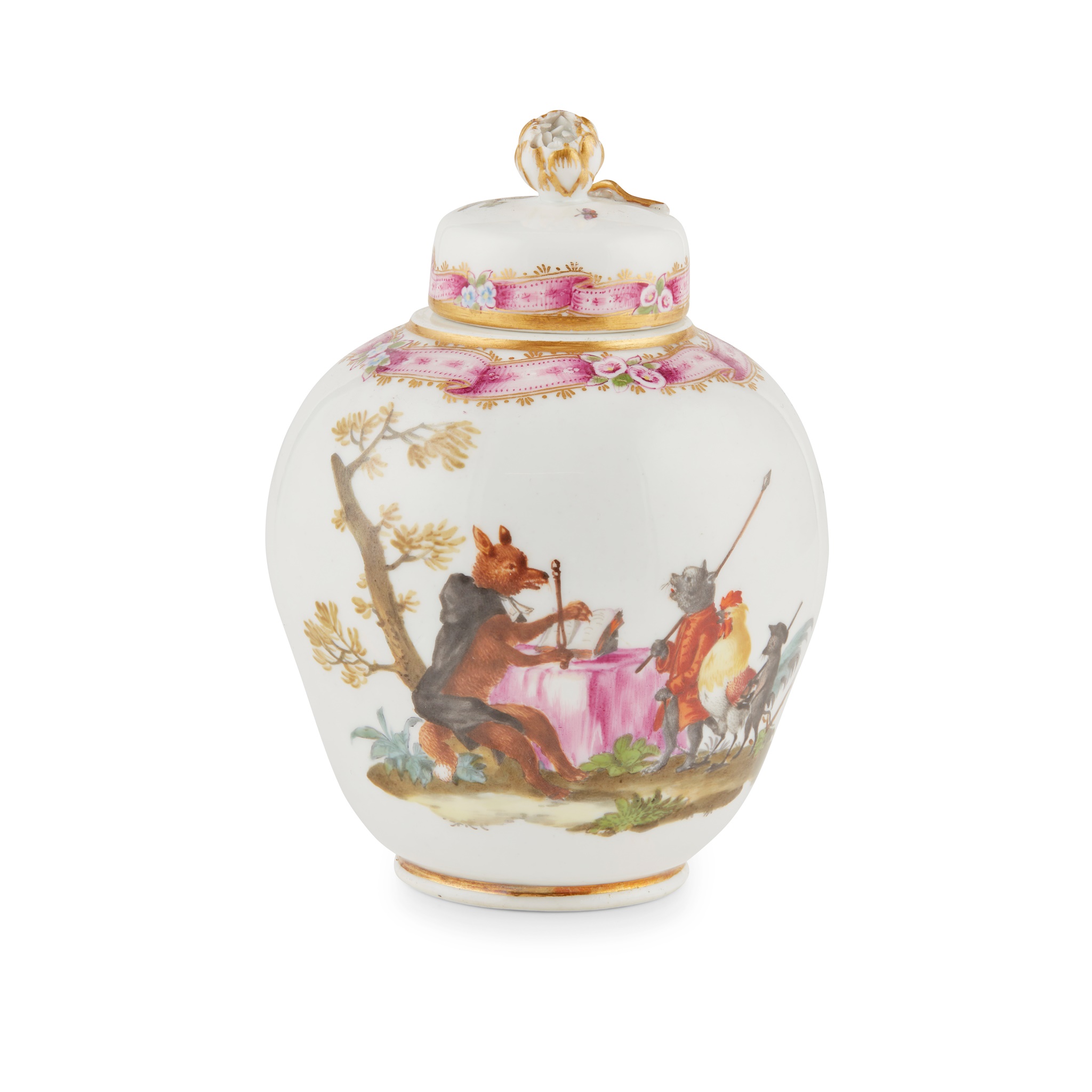 decoration attributed to Johann Georg Loehnig, the body of ovoid form, painted to each side with a humorous vignette, one side depicting a fox in ceremonial dress reading to an assembled group of a cat, cockerel and rat, two of whom carry a weapon; painted to the other side with a finely dressed cat and dog being pulled in a covered carriage by a cockerel and a rabbit; the body and cover with a gilt edged pink ribbon border incorporating small sprays of flowers; the cover with a finial handle in the form of a flower picked out in gilt; crossed swords with dot mark