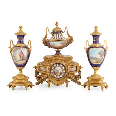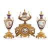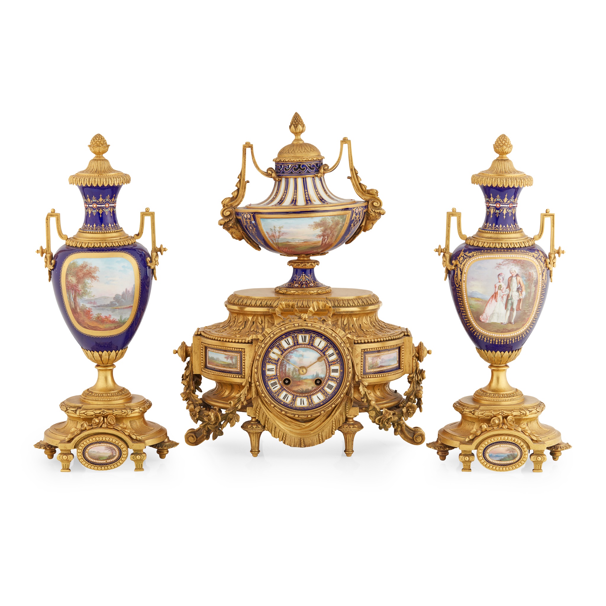 FRENCH GILT BRONZE AND SÈVRES STYLE 'BLEU DE ROI' PORCELAIN MANTEL CLOCK GARNITURE