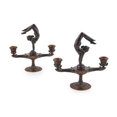 PAIR OF FRENCH PATINATED AND GILT BRONZE TWO-LIGHT CANDELABRA, AFTER EMILE-JOSEPH-NESTOR CARLIER