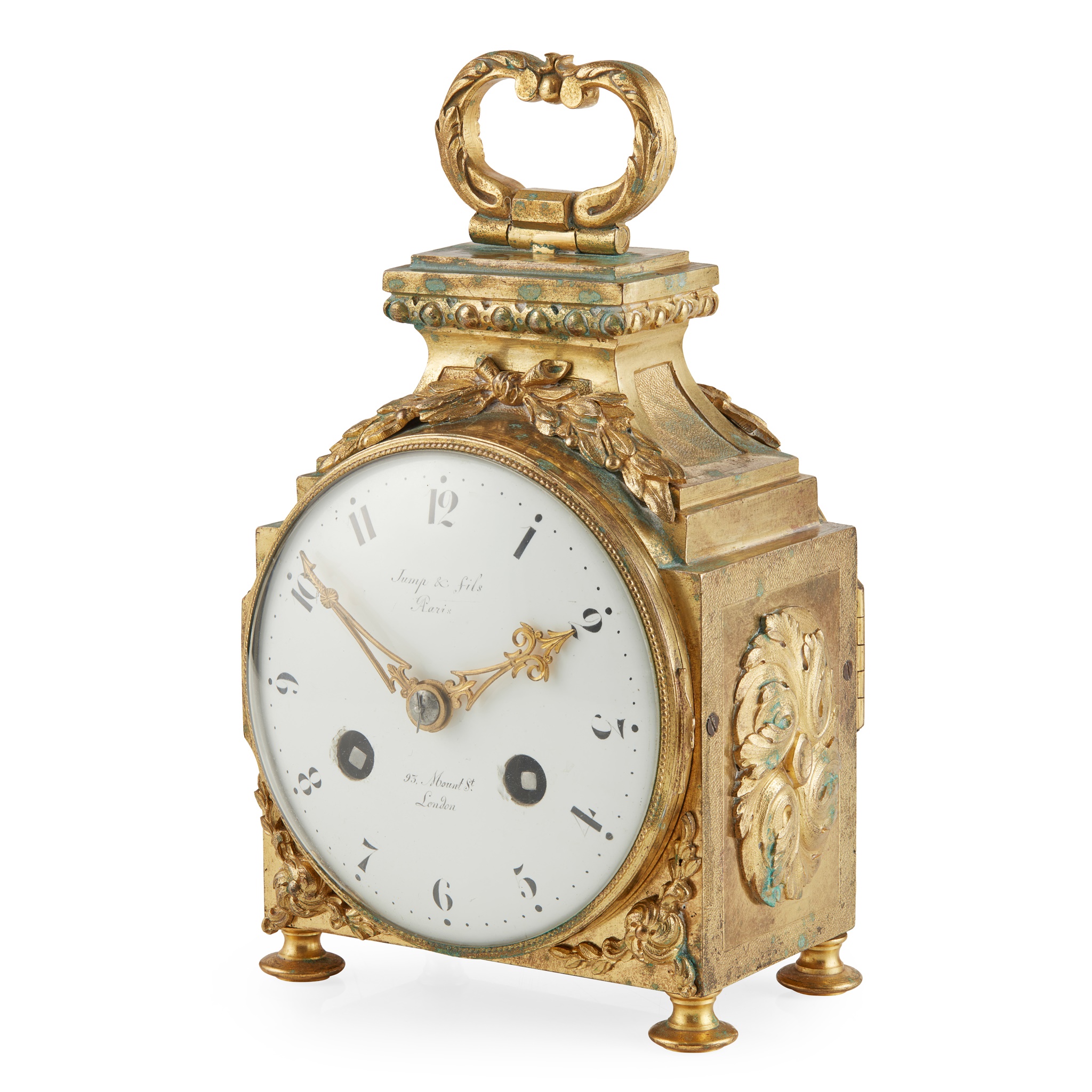 the white enamel dial with Arabic numerals, two winding holes and signed 'Jump & Fils, A/Paris' and '93 Mount St, London', in a beaded bezel and gilt bronze case with flower heads, laurel wreath and acanthus loop handle, raised on pad feet, the twin train brass movement striking a bell