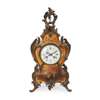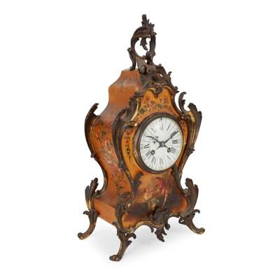 the cream enamel dial with black Roman numerals, the waisted case with rococo style acanthus mounts, the Vernis Martin body with central scene of an amorous couple in a garden surrounded by floral swags and scenes, on scrolling feet, the twin train brass Japy Frères movement striking a coiled steel gong