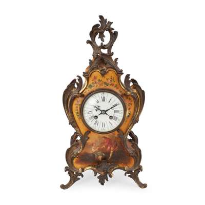 FRENCH GILT VERNIS MARTIN AND GILT BRONZE MANTEL CLOCK