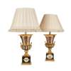 in the manner of Jacob Petit, of panelled campagna form with gilt serrated rims, the bodies painted with figures of Far Eastern men alternating with panels with scrolling foliate motifs, the lower body with moulded ovals brightly enamelled within gilt borders, with twin mask handles, on faceted socles raised on square section bases enamelled with panels of flowers and butterflies within gilt borders on a black ground, with a pair of cream pleated shades; unmarked