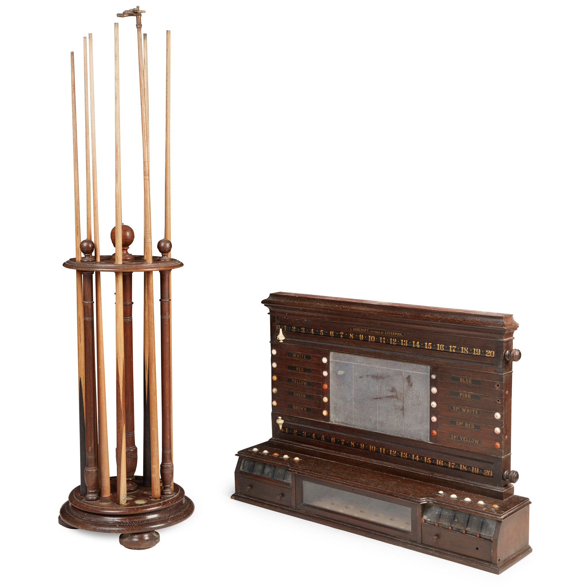 made by J Ashcroft, Victoria St, Liverpool, the board with sliding score keepers with ivory knobs and a central slate, above a central ball rack with a hinged glazed front flanked by two slot drawers; together with an OAK REVOLVING CUE RACK AND A SELECTION OF CUES