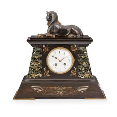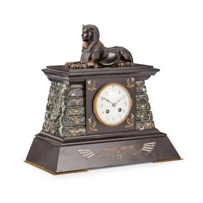 FRENCH EGYPTIAN REVIVAL SLATE, GREEN MARBLE, AND BRONZE MANTEL CLOCK