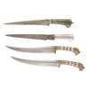 all with watered steel blades, including a pair of Pesh Kabz daggers with green stone and mother-of-pearl with red and black enamel handles, a Pesh Kabz type dagger with jadeite handle and Kard type dagger with a rock crystal handle with floral embossed white metal collar and gold damascene decoration at forte
