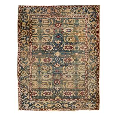 the indigo field with allover palmette and foliate vine pattern, within indigo border