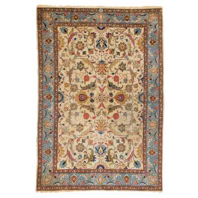 the cream field with allover palmette and foliate vine pattern, within light blue border, signature to one end