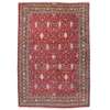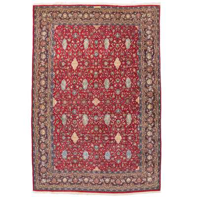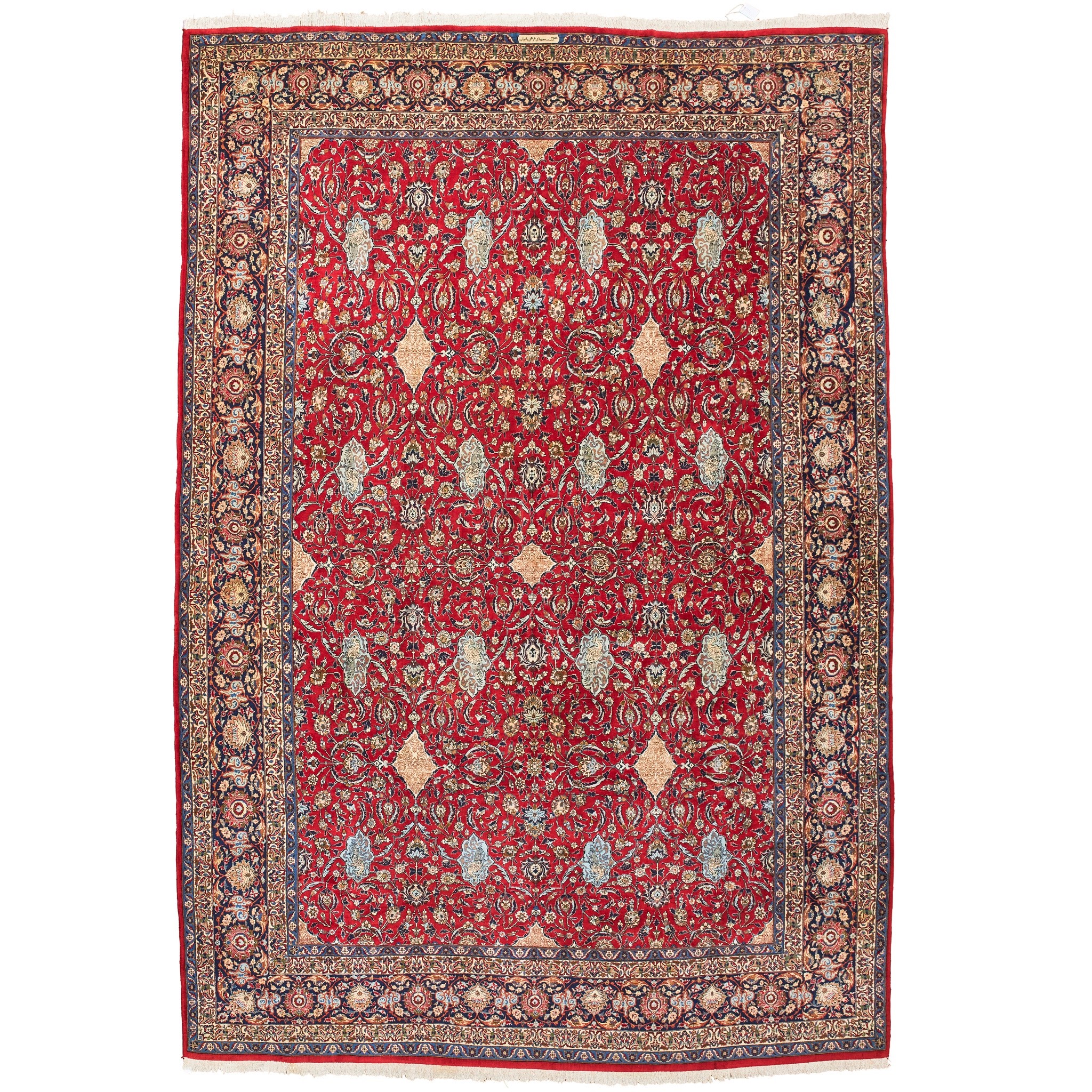 the red field with allover bird and arabesque cartouche pattern, within indigo border, signature to one end