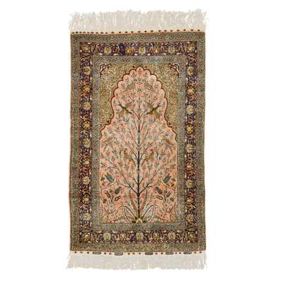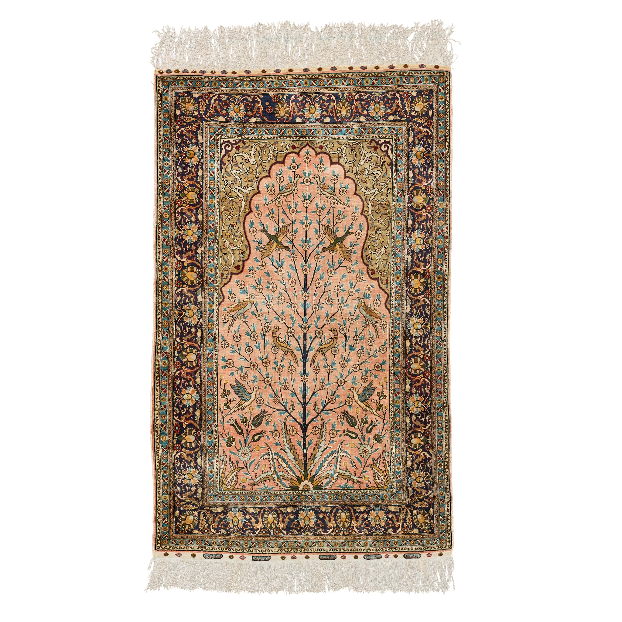 the pale pink mihrab with bird filled tree of life, light brown spandrels, within indigo border