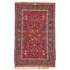 the red field with allover palmette and foliate vine pattern, within indigo border, signature to one end