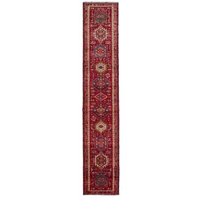 the red field with column of polychrome medallions, within narrow salmon pink border