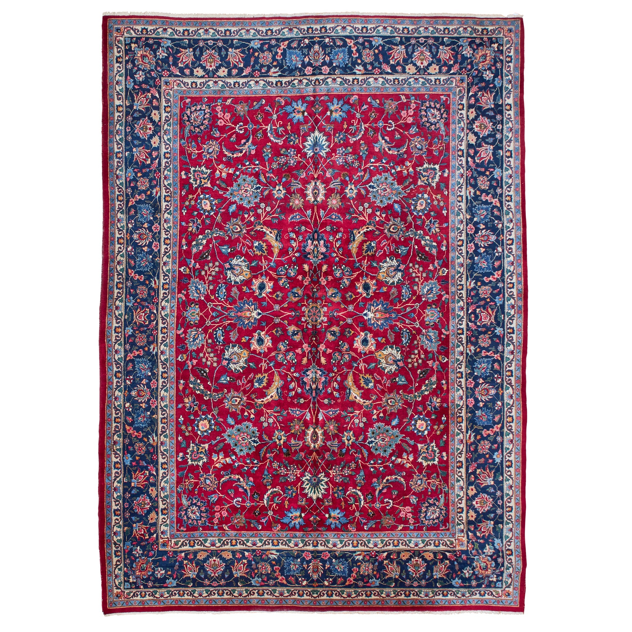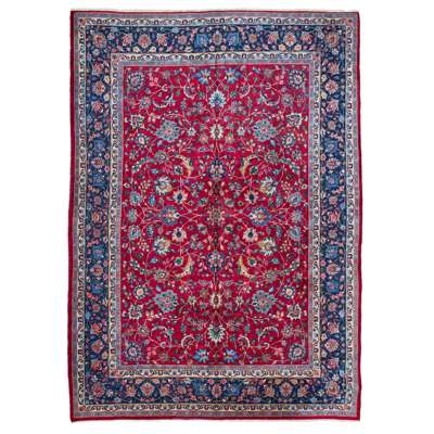 the raspberry field with allover palmette and foliate vine pattern, within indigo border