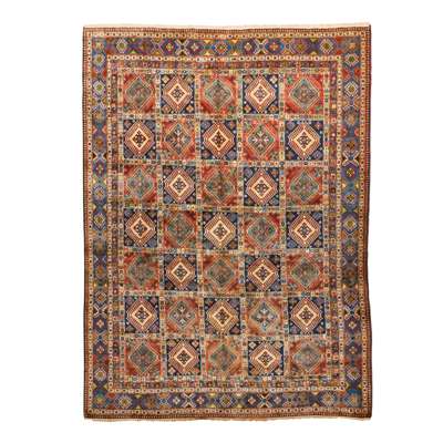 of Qashqai design, the field with allover polychrome hooked lozenge lattice pattern, within blue border