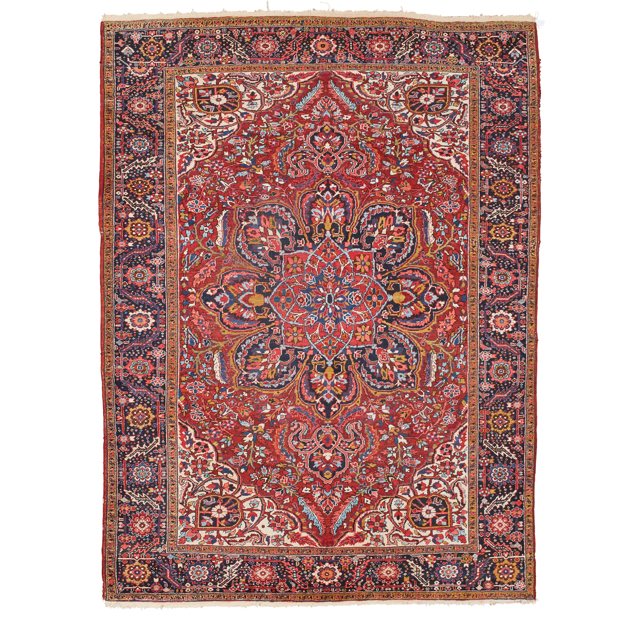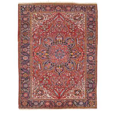 the red field with indigo and red cusped medallion, ivory spandrels, within indigo border