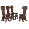 of sgabello form, the shield shaped backs with a central roundel with a carved armorial, raised on vasiform supports with moulded roundels