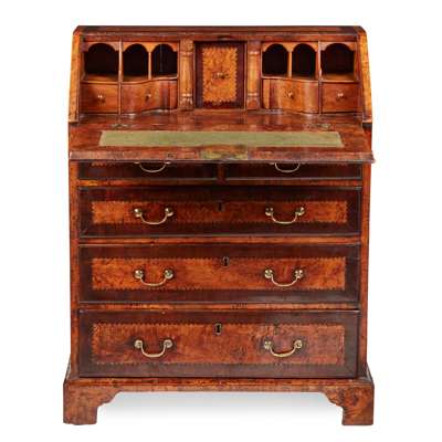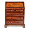 the cross and chequer banded slope opening to an arrangement of pigeon holes and drawers above two short and three long graduated drawers, on bracket feet
