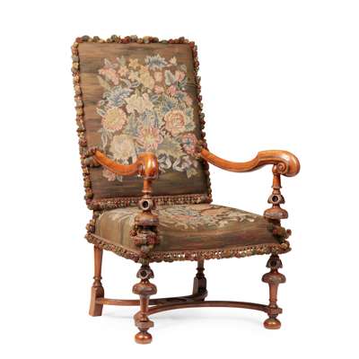 WILLIAM AND MARY STYLE WALNUT AND NEEDLEWORK UPHOLSTERED ARMCHAIR