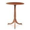 the crossbanded circular top on a line inlaid tapered column and outswept legs ending in brass caps and castors