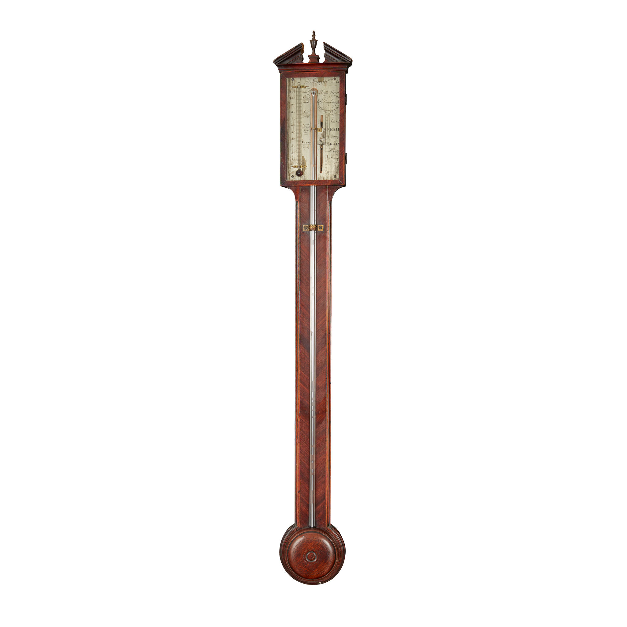 the broken arch pediment over a silvered register with thermometer/ barometer gauges, signed ‘D Stampa & Co, No. 14 Leith Street, Edinburgh’, the exposed tube with moulded ball cistern cover