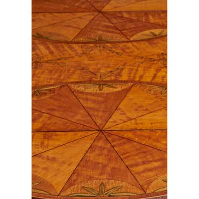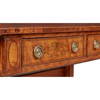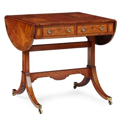 FINE GEORGE III SATINWOOD, INLAY AND PENWORK SOFA TABLE, IN THE MANNER OF INCE & MAYHEW
