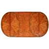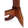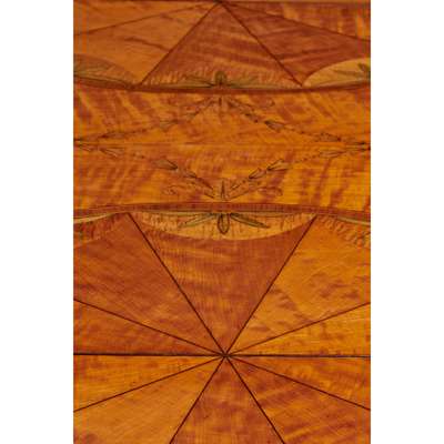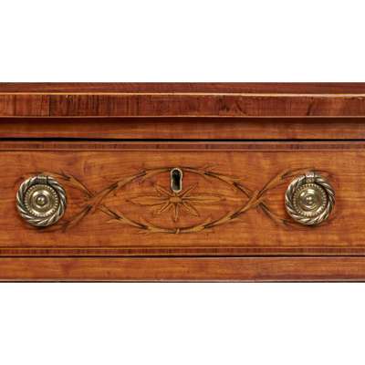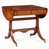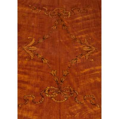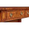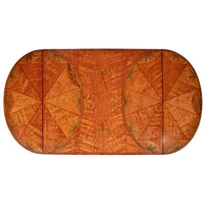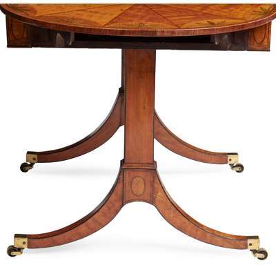 the rounded rectangular top with drop-leaf sides inlaid with ribbon-tied garlands and twin fan veneered ellipses with stiff leaf decoration, above a frieze with two short drawers, raised on squared end supports joined by a shaped stretcher and raised on outswept sabre legs ending in brass caps and castors
