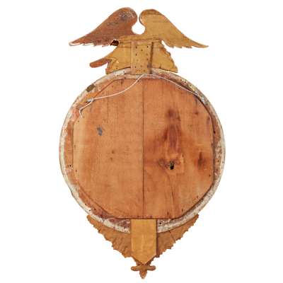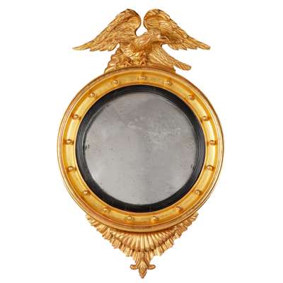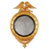 the circular mirror plate in a reeded ebonised slip and deep moulded frame with ball mounts, surmounted by a carved eagle cresting
