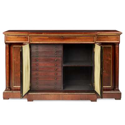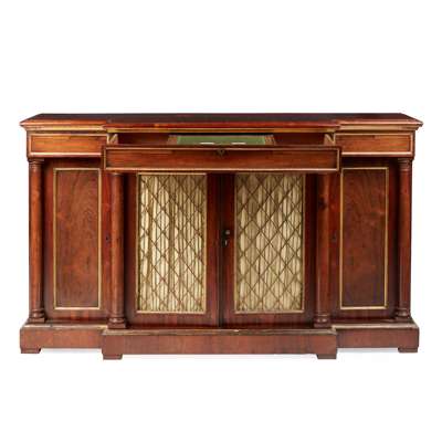 of breakfront outline, the top with a moulded edge above a long frieze drawer flanked by short drawers, the centre drawer fitted with an adjustable writing slope, over a pair of doors with brass grille inserts lined with yellow silk and opening to reveal an arrangement of graduated drawers and compartments, flanked by further cupboard doors divided by columns, on a conforming plinth base