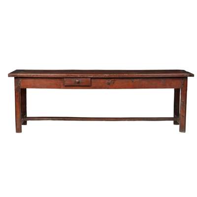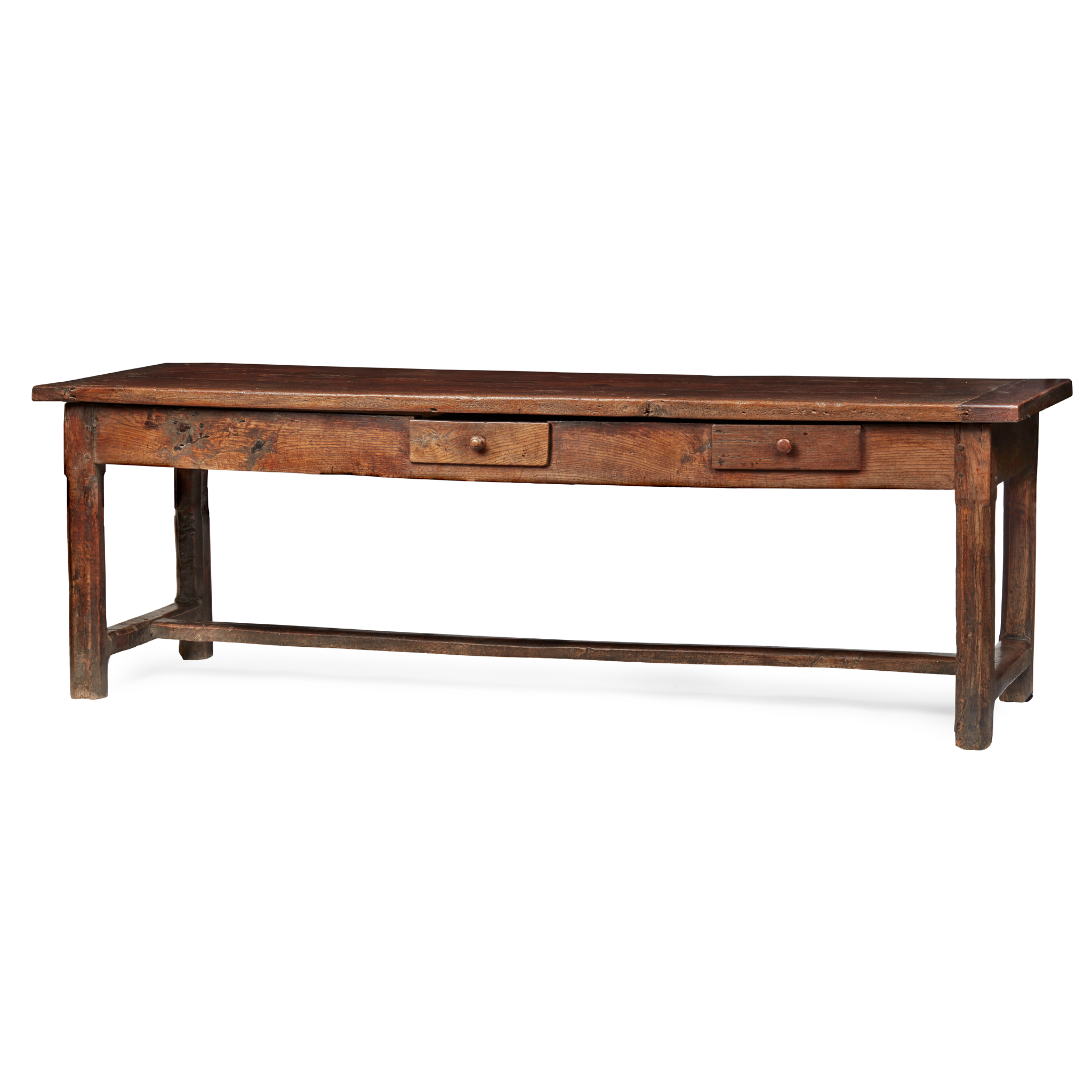 the cleated three board top above a deep frieze with two short drawers and a single short drawer to the reverse, raised on chamfered legs joined by an H stretcher