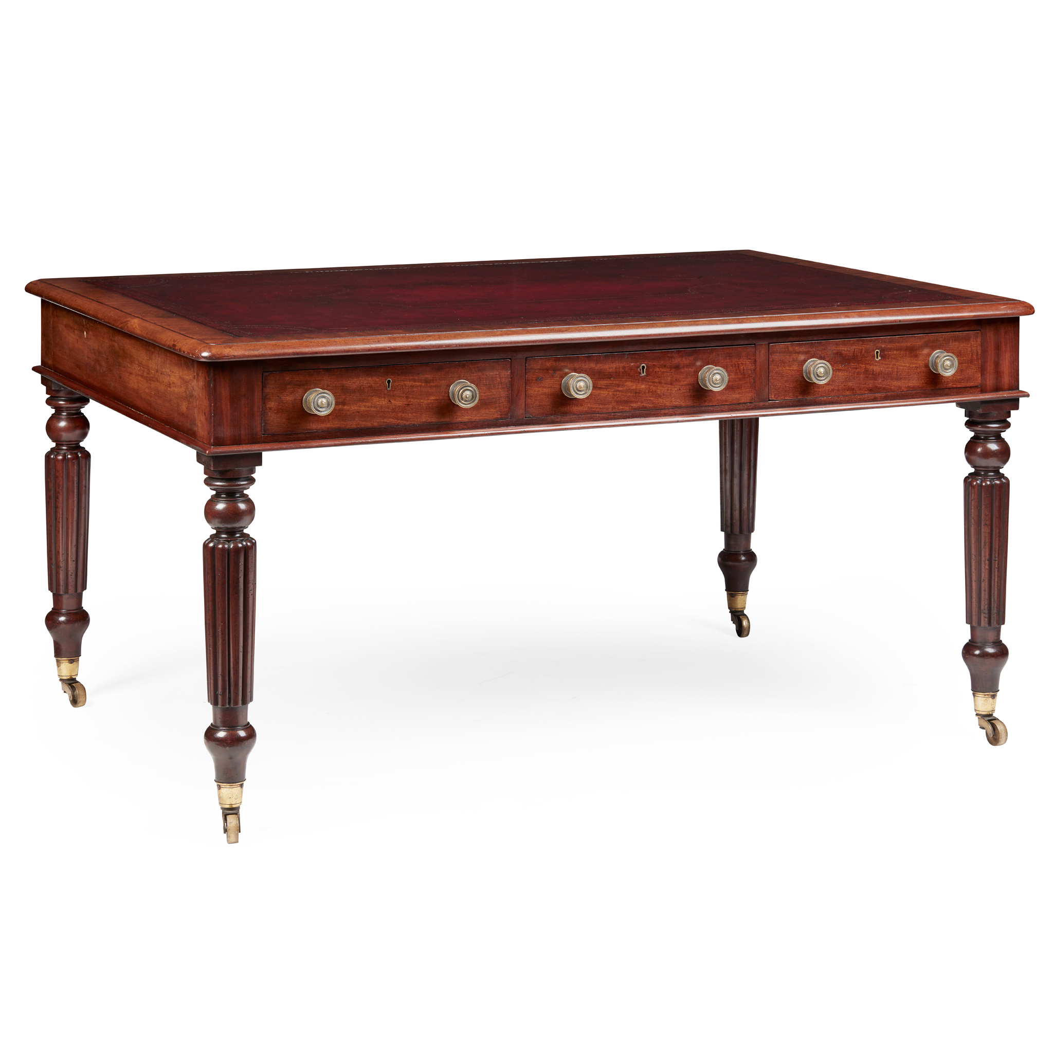 the crossbanded top with a moulded edge and oxblood tooled leather writing surface, above three frieze drawers with the same on the reverse, raised on turned and reeded tapering legs ending in brass caps and castors