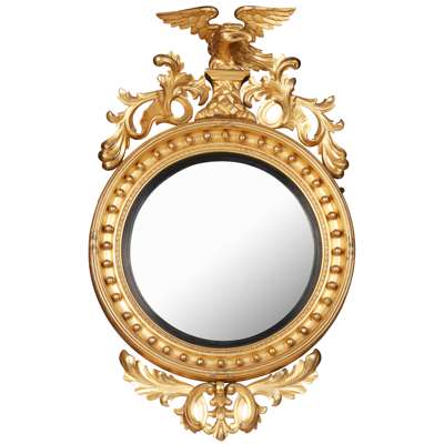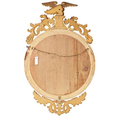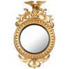the circular mirror plate in an ebonised reeded slip and deep moulded frame with ball mounts, surmounted by a carved eagle cresting with acanthus scrolls