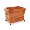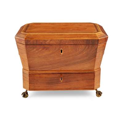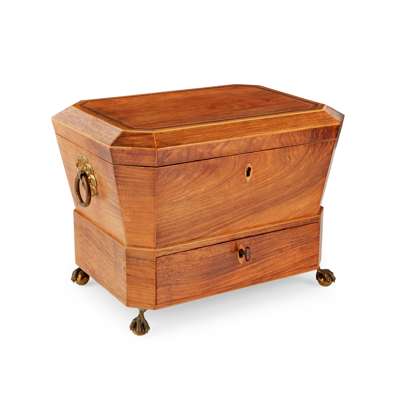 of tapered sarcophagus form, the hinged cover with rosewood and fruitwood banding, opening to reveal a velvet lined interior, the base with a drawer, the sides with gilt metal ring handles, raised on gilt metal claw and ball feet