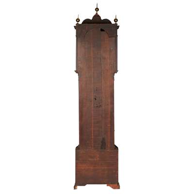 the hood with swan neck pediment painted with panels surmounted by three brass ball finials, the breakarch door flanked by Doric fluted columns, enclosing a 14 inch engraved brass breakarch dial with Roman numerals and Arabic five minute markers, subsidiary seconds and date dials, the arch with moonphase and signed ‘John, Heaton, Haworth', the wide trunk with a shaped arch door flanked by carved Doric fluted quarter columns, on a plain square plinth base with canted corners, raised on ogee bracket feet, the twin-train movement with anchor escapement, striking a bell
