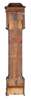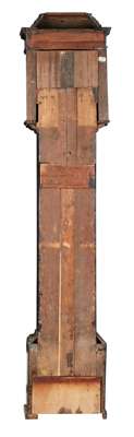 the hood with caddy top over a flat moulded cornice with pierced frieze, the square door flanked by barley twist columns, enclosing an 11 inch brass dial with silvered chapter ring, Roman numerals with Arabic five minute markers, subsidiary seconds dial with date aperture below, signed to lower edge 'Jn Wemyss, Edinburgh', with pierced mask spandrels, above a triple moulded rectangular trunk door, on a square plinth with moulding, the twin train movement with anchor escapement, striking a bell