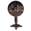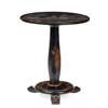 the circular tilt top decorated with an exotic scene with temples and pavilions, on a bulbous column and circular base with scroll feet all with gilt foliate decoration