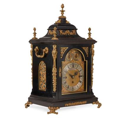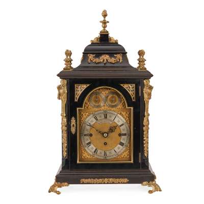 GEORGIAN STYLE EBONISED AND GILT BRASS QUARTER STRIKING AND CHIMING TABLE CLOCK