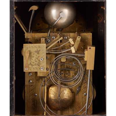 the gilt break arch dial with silver chapter ring with Roman numerals and Arabic five minute markers, signed ‘Mackay, Cunningham & Co, Edinburgh’, the arch with subsidiary ‘Chime/Silent’ and ‘Westminster Chimes/Chime on 8 Bells/Chime on 10 Bells’ dials, the large bell top case with flaming urn finials, the front dial flanked by caryatid appliques, the sides with pierced Rococo style gilt brass grills and a pair of swing handles, on cast scroll bracket feet, the triple train chain fusee movement striking the hour on a large coiled blued steel gong, striking the quarters on four coiled blued steel gongs and playing on a pin wheel activated nest of ten bells