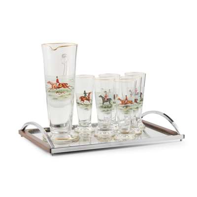 ART DECO STYLE ENAMELLED GLASS LEMONADE SET, OF HUNTING INTEREST