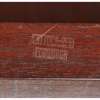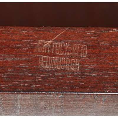 the hinged top with a cushion covered in original green plush, opening to a void interior; with a crossbanded front panel and moulded sides with quatrefoil cut out panels carved with stylised foliate motifs against a red ground, on trestle bases, stamped WHYTOCK & REID/ EDINBURGH
