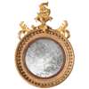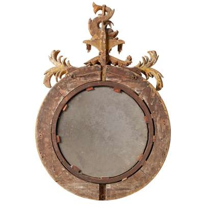 the circular mirror plate in a ebonised reeded slip and deep moulded frame with ball mounts, surmounted by a carved dolphin fountain cresting with foliate scrolls