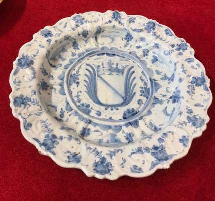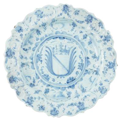 painted to the centre with a coat of arms, the well and rim moulded with scrollwork detail, the arms enclosed within alternating panels of ships and buildings, with foliate designs to the shaped rim, underglaze blue shield mark to the reverse, bearing a paper label for D. M Archer