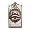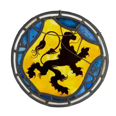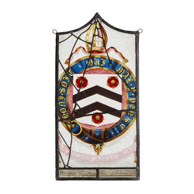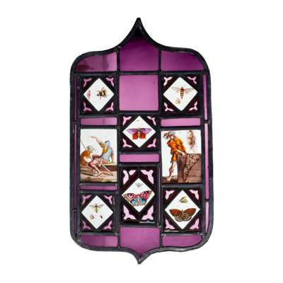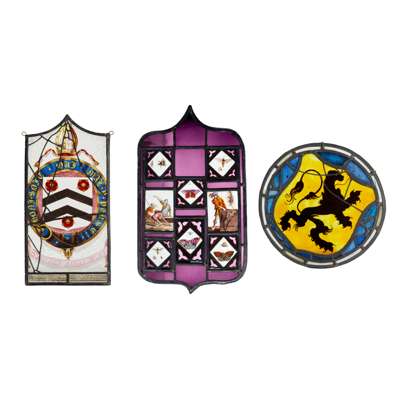 including a stained glass roundel, possibly 16th century, enamelled with a lion rampant within a shield shaped cartouche; one of rectangular pointed arch form divided into panels depicting insects, moths and two figural scenes; and one an armorial panel from Besselsleigh Rectory enamelled with a crest and garter with inscribed motto, and inscribed to the lower panels ‘Until 1960 this armorial glass was at Besselsleigh Rectory. A former rector Dr H. D. Harper was a Fellow of Winchester College’ (3)