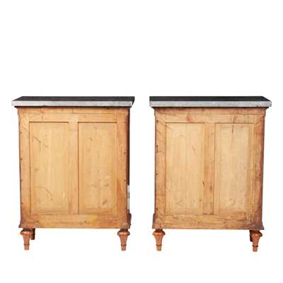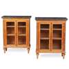 the rectangular black marble tops above pairs of doors with brass wire inserts and outlined with ebony banding, on turned and tapered feet (2)