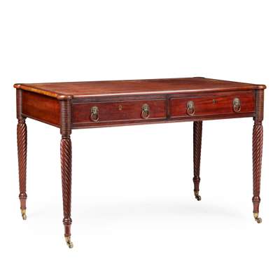 the top with a brown leather writing surface and outset rounded corners over two short frieze drawers with dummy drawers on the reverse, raised on spiral carved legs ending in brass caps and castors