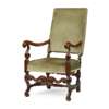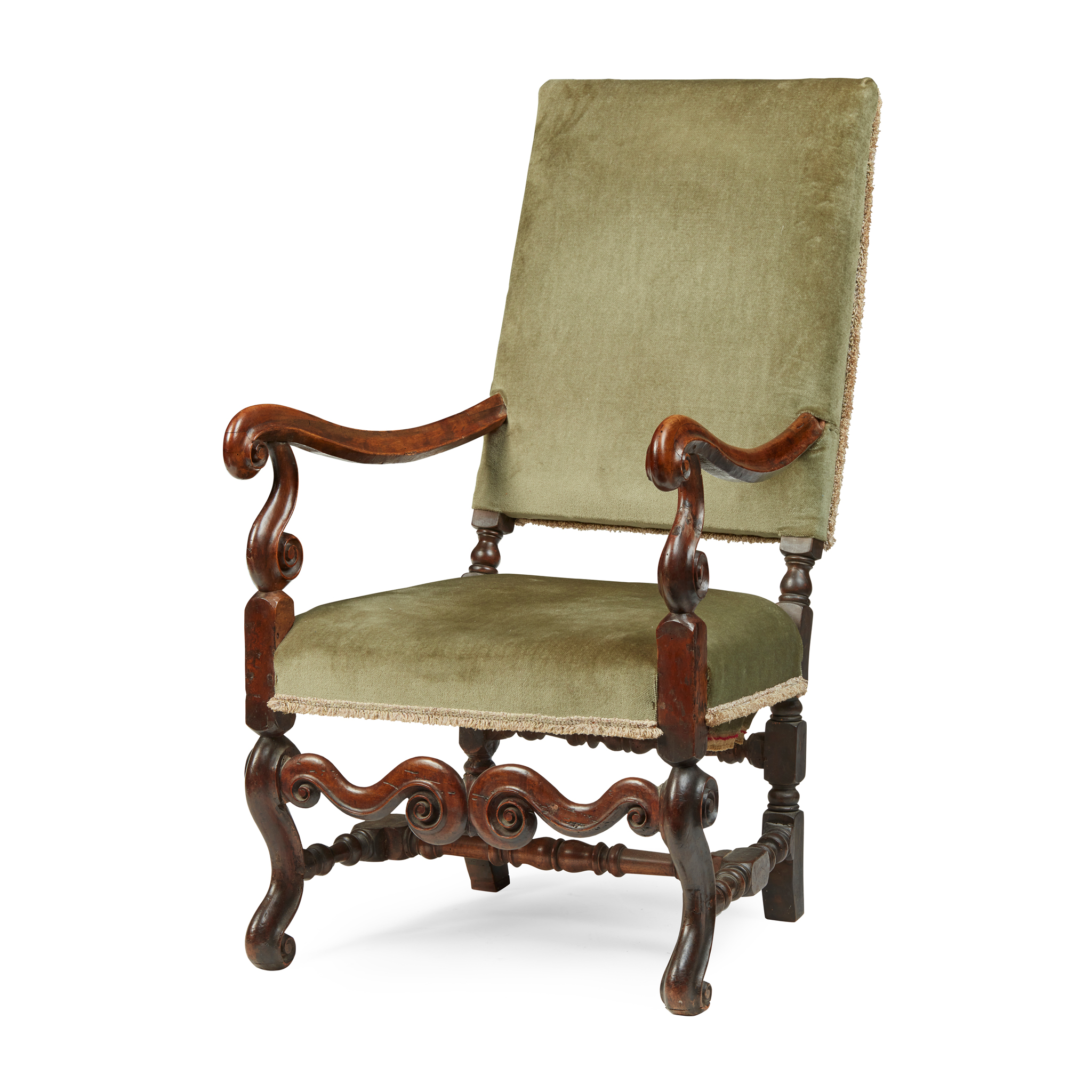 FLEMISH WALNUT AND UPHOLSTERED OPEN ARMCHAIR