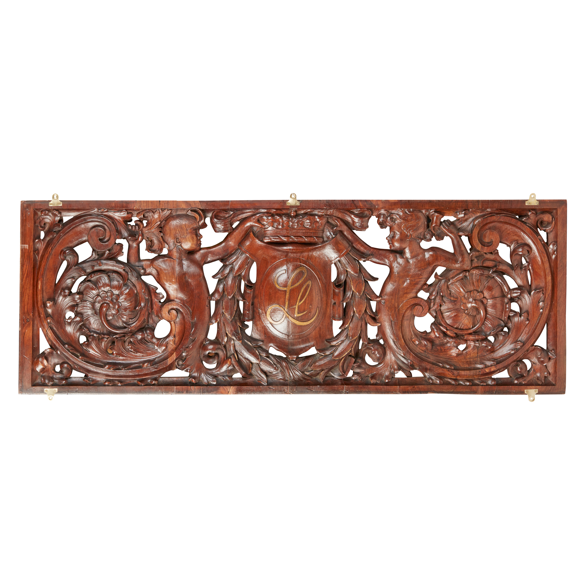 carved and pierced to both sides with a central cartouche with the initials ‘Le’ beneath a coronet, within a laurel wreath and flanked by figures and foliate scrolls