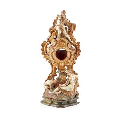 carved in the auricular style with rocaille and C-scrolls, the aperture surmounted with a figure of Chronos, the base with a reclining female nude alongside a dog, raised on a simulated marble shaped plinth base